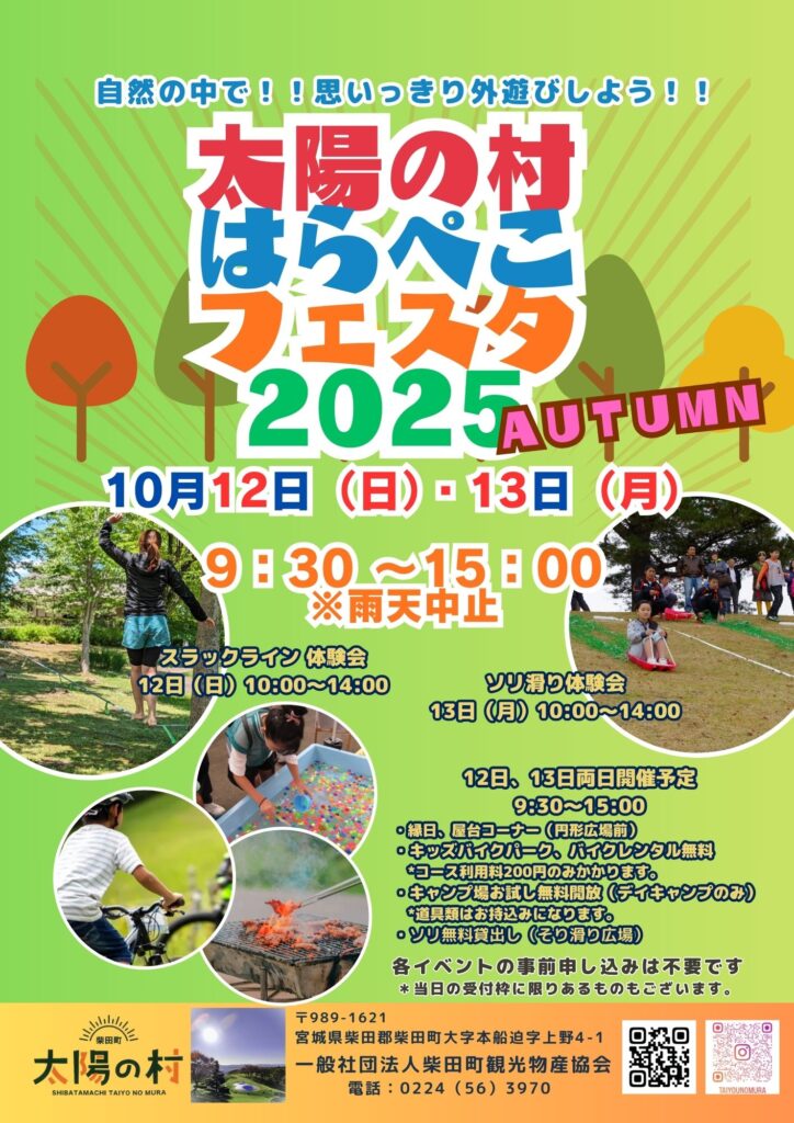 2025年10月12日(日)、13日(月)太陽の村「はらぺこフェスタ2025」を開催します、例年行われていた「キッズバイクパークフェスタ」に代わり、太陽の村での外遊びをテーマに秋のイベントを開催いたします。