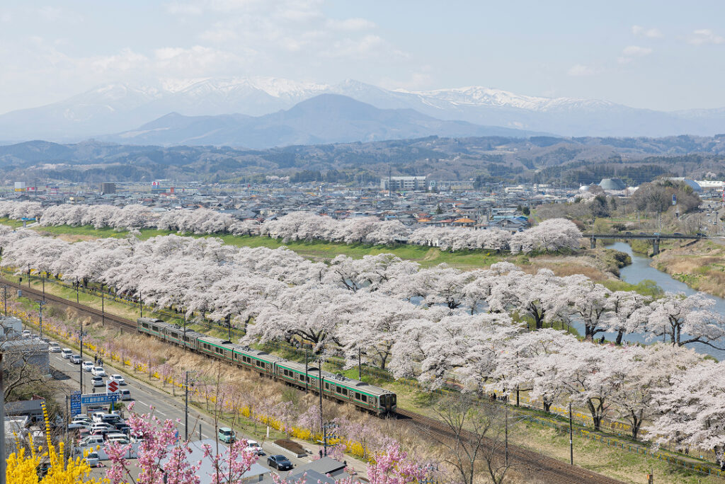 橋の下にはJR東北本線が走り、蔵王と桜並木を背景にした鉄道との風景が楽しめることで全国に知名度が上がりました。