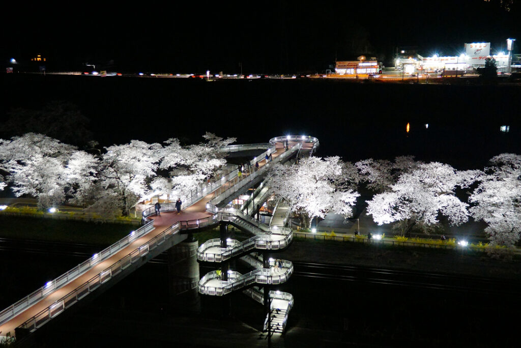 また平成27年(2015年)に完成した船岡城址公園と一目千本桜をつなぐ「しばた千桜橋」を上から撮影できるので、ライトアップされた夜桜の撮影スポットとしても人気です。