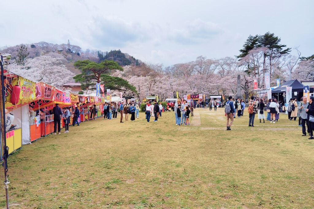 船岡城址公園の山頂は標高136mの地点にあり、西側には残雪をまとった蔵王山、東側に太平洋を望み、眼下には白石川沿いの8キロにわたる「一目千本桜」1,200本と船岡城址公園の桜1,300本、合わせて2500本の桜を山頂から一望でき、澄み渡る空と河川の青、残雪と雲の白、山谷の緑、そして桜のピンクが東西に巨大なキャンバスで描かれます。